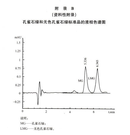 分別注入50 /L濃度為0.1μg/mL的孔雀石綠溶液、無色孔雀石綠工作溶液及樣品提取溶液于液相色譜儀中,按上述色譜條件進行色譜分析,記錄峰面積,響應值均應在儀器檢測的線性范圍之內。根據標準樣品的保留時間定性,外標法定量。標準品色譜圖見附錄B。