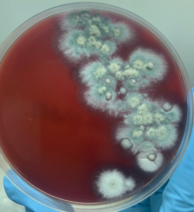 在血瓊脂平板上,煙曲霉菌的菌落特征明顯: